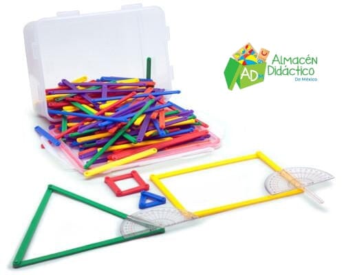 216 Líneas geométricas de diferentes colores y medidas 2 Medidores de ángulos 1 Regla métrica plegable 1 Guía didáctica