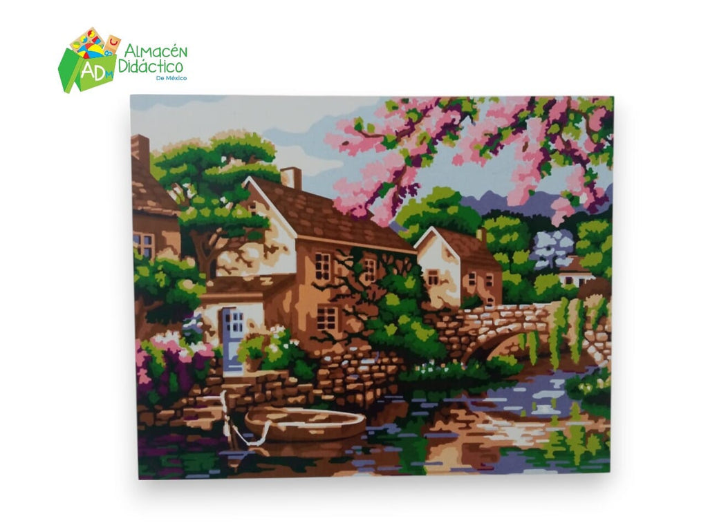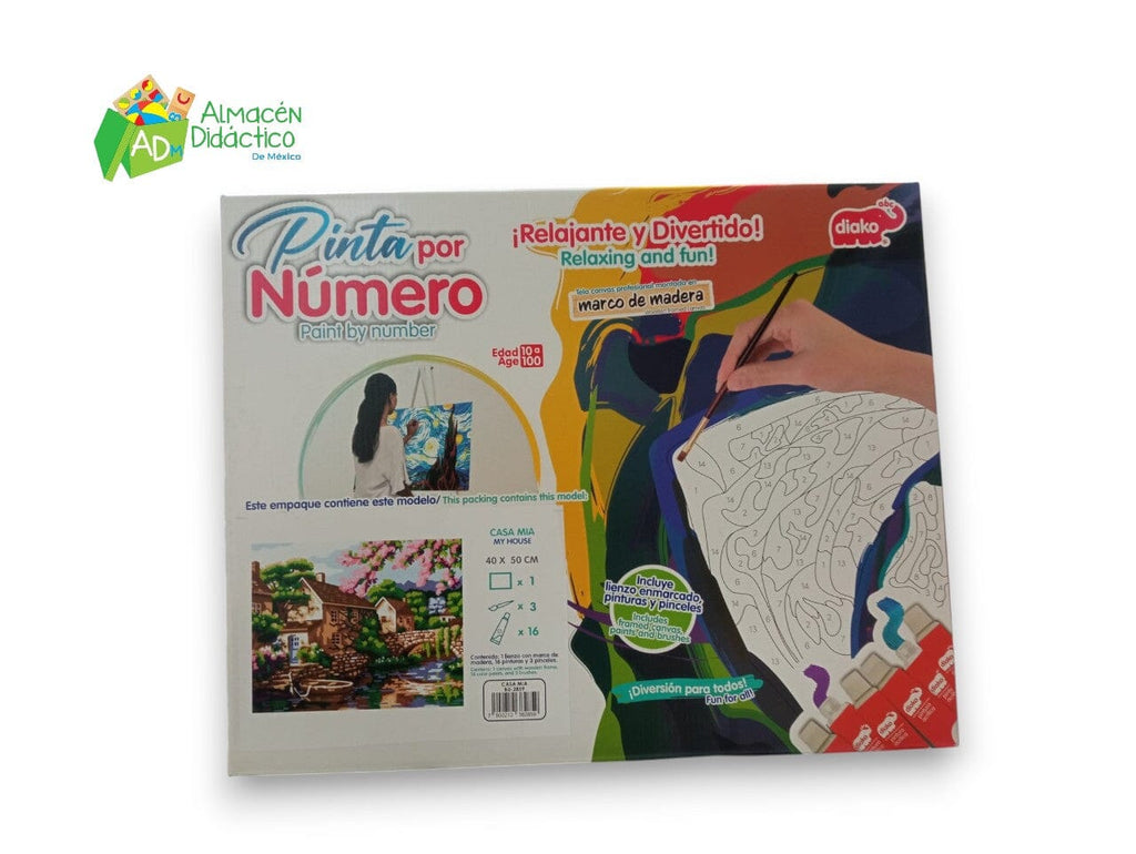 Contiene: un lienzo en marco de madera, 28 pinturas, 3 pinceles, 1 paleta de pintor.