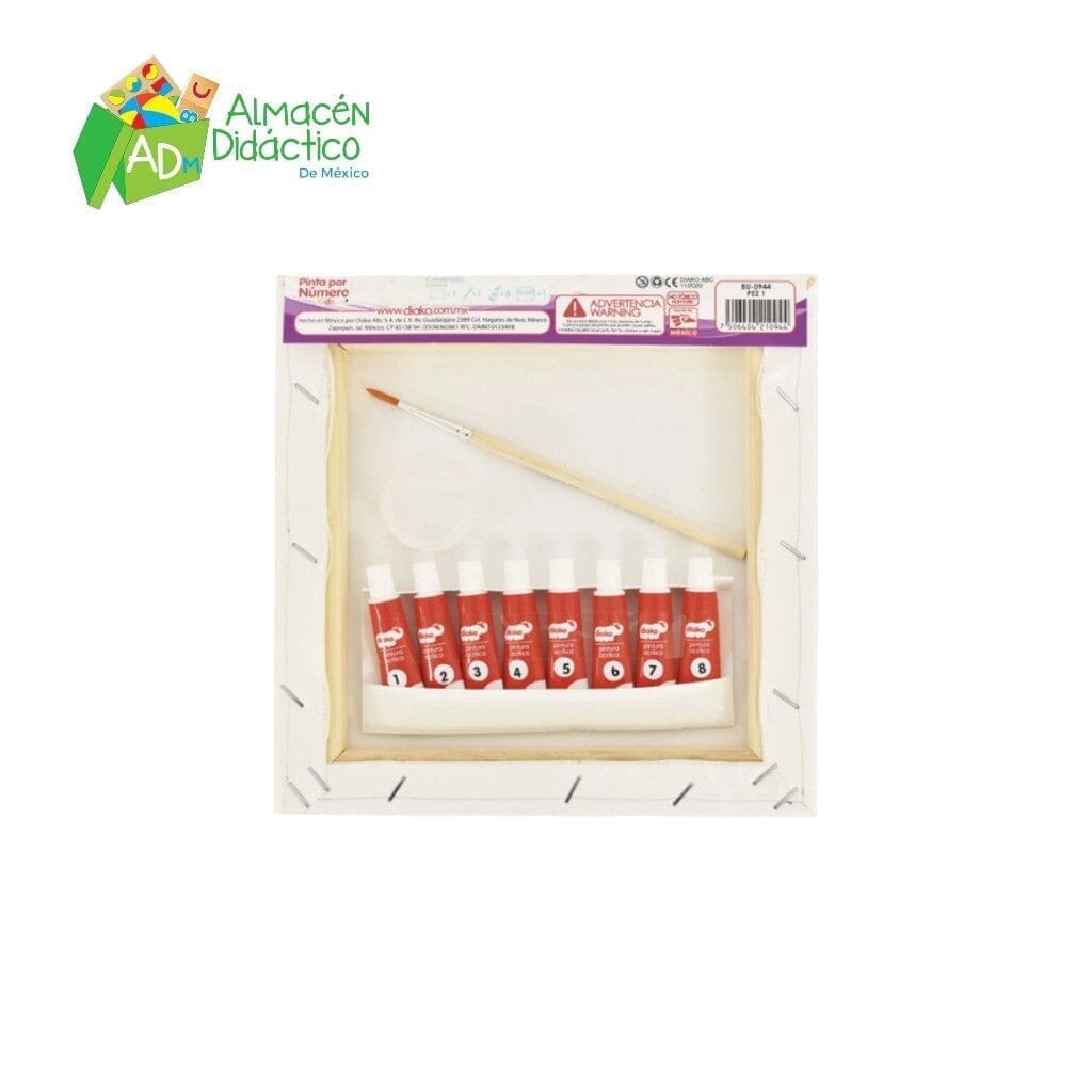Contiene: un lienzo en marco de madera, 7 pinturas, 3 pinceles, 1 envase de plástico.
