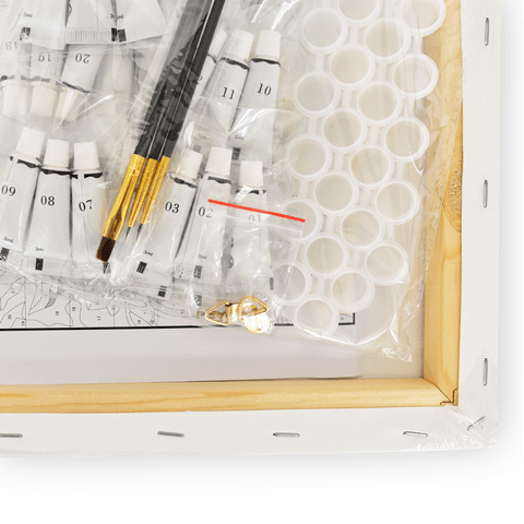 Contiene: un lienzo en marco de madera, 18 pinturas, 3 pinceles, 1 paleta de pintor.