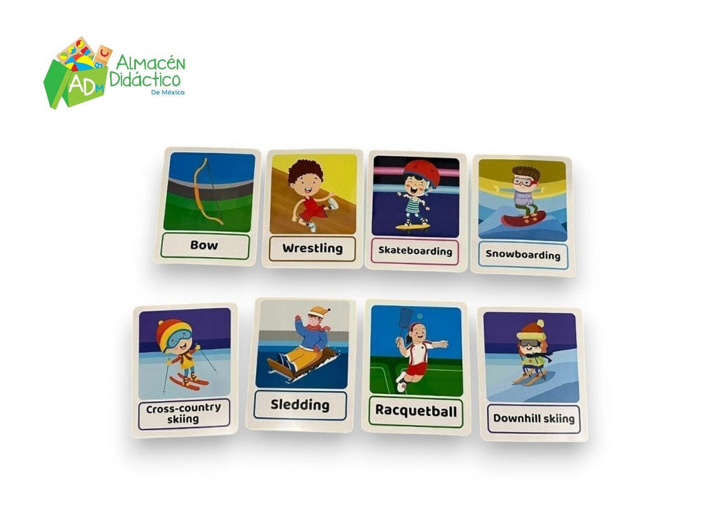 Este material ayuda a los niños a reconocer y memorizar, palabras relacionadas con los deportes en inglés, desarrolla habilidades lingüísticas desde temprana edad, refuerza su memoria visual.
