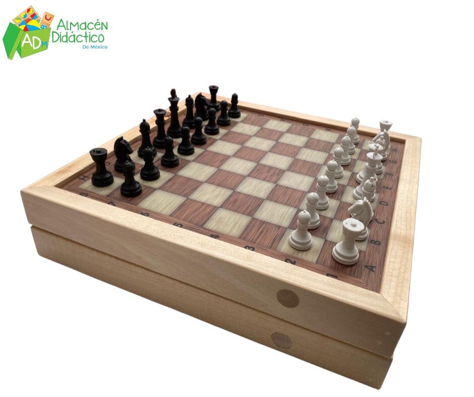 Contiene: 1 set de ajedrez, 4 fichas de colores de plástico, 1 dado, 10 fichas de madera.