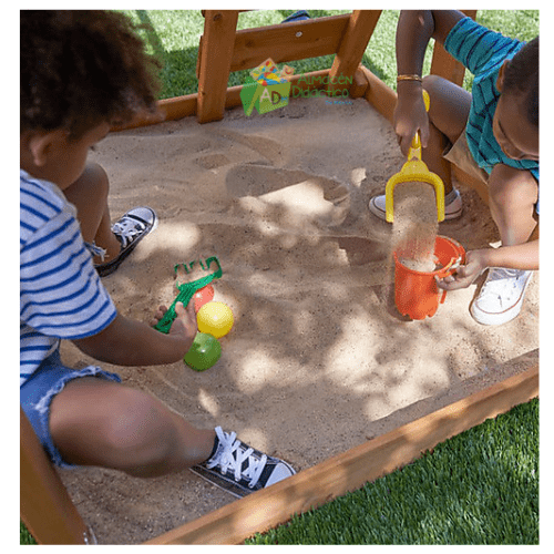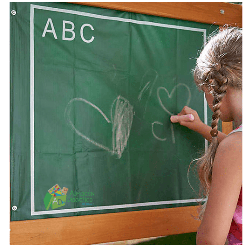 Este juego de exterior incluye dos columpios , tobogán,  pared de roca para escalar y casita con sombra en el nivel superior. Además de pizarrón para gis.