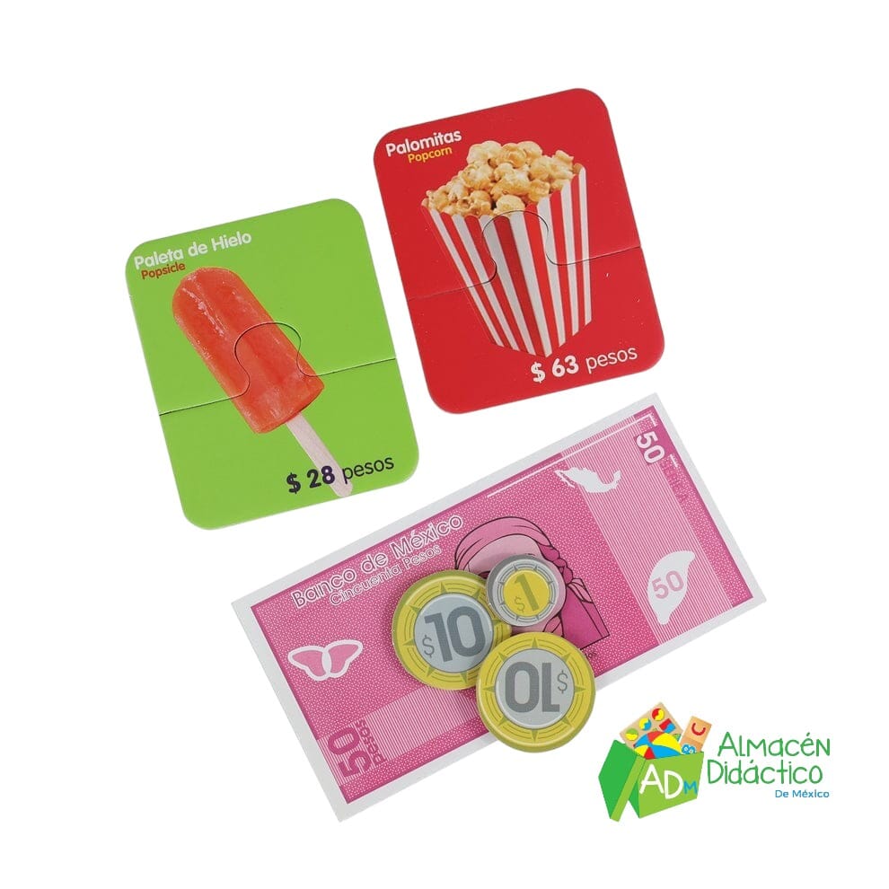 ¡El juego de la tiendita incluye tarjetas con imágenes de productos, billetes y monedas mexicanas!