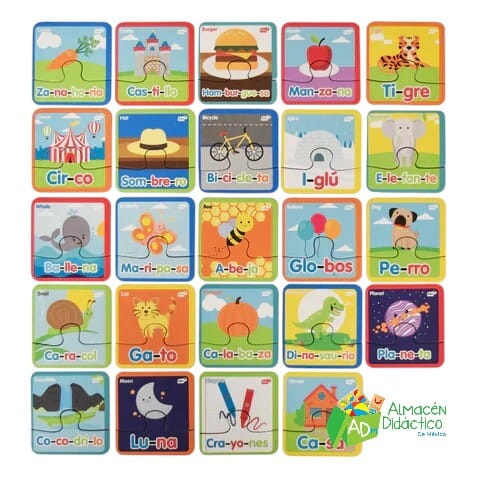 Tarjetas estilo rompecabezas que refuerzan el aprendizaje de las sílabas. Lee la palabra sílaba por sílaba y encuentra el dibujo que lo ejemplifica. Perfecto juego para empezar la lectura y desarrollar el vocabulario.