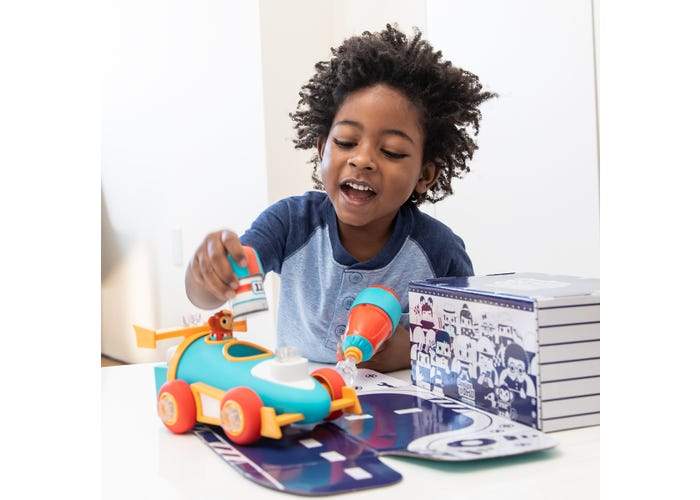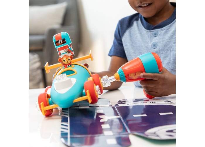 Incluye taladro eléctrico apto para niños, carrocería de coche de carreras, 7 piezas a presión, 9 pernos, un controlador Bolt Buddy y figuritas de amigos del equipo de boxes.