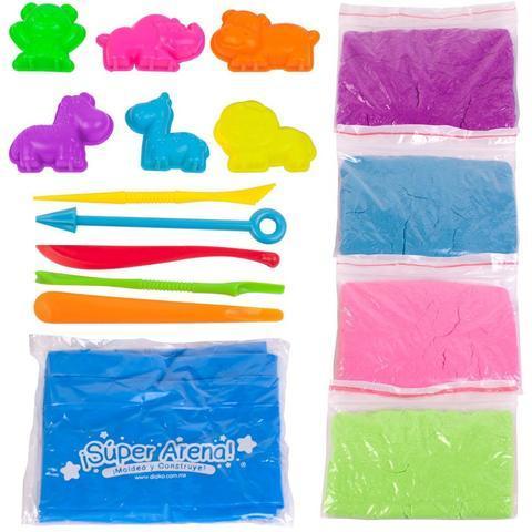 Contiene: una pieza con 125 gr de color morado, azul, verde y rosa, una charola inflable, 5 herramientas, 6 moldes y 1 rodillo de plástico