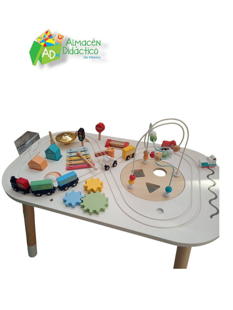 Esta mesa con distintas actividades de didácticas ayuda a los niños a mejorar sus habilidades motoras finas como coordinación mano-ojo, fomenta habilidades de resolución de problemas, así como mejora su concentración y asociación.