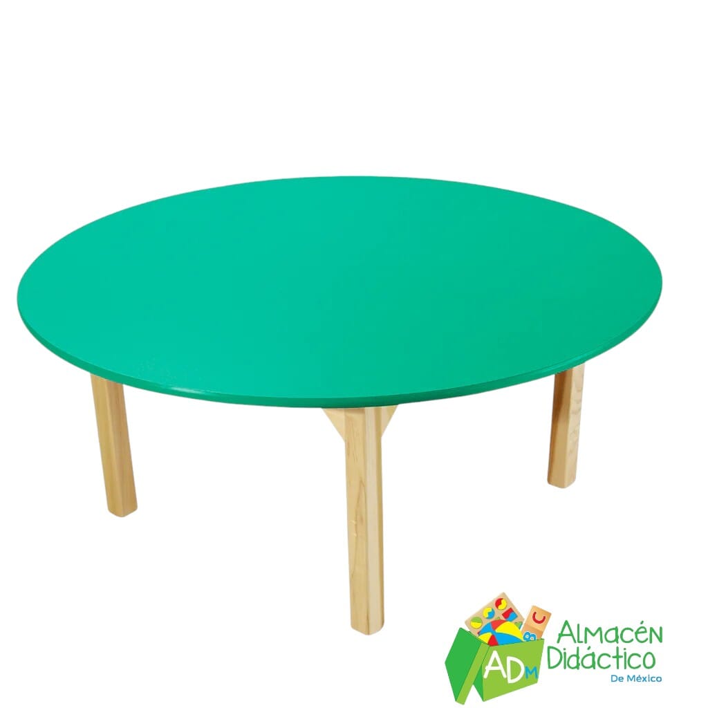 Mesa redonda con cubierta de melamina y patas de madera, ideal para áresa de juego, consultorios, guarderias, ludotecas, hogar, etc.