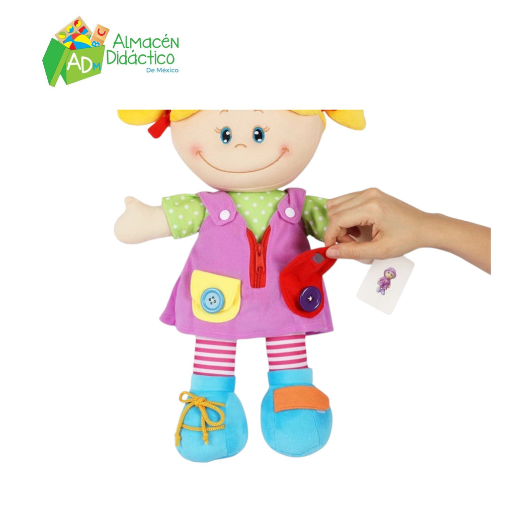 Es una muñeca con diferentes actividades para aprender a vestirse con botones, agujetas, cierres, etc.